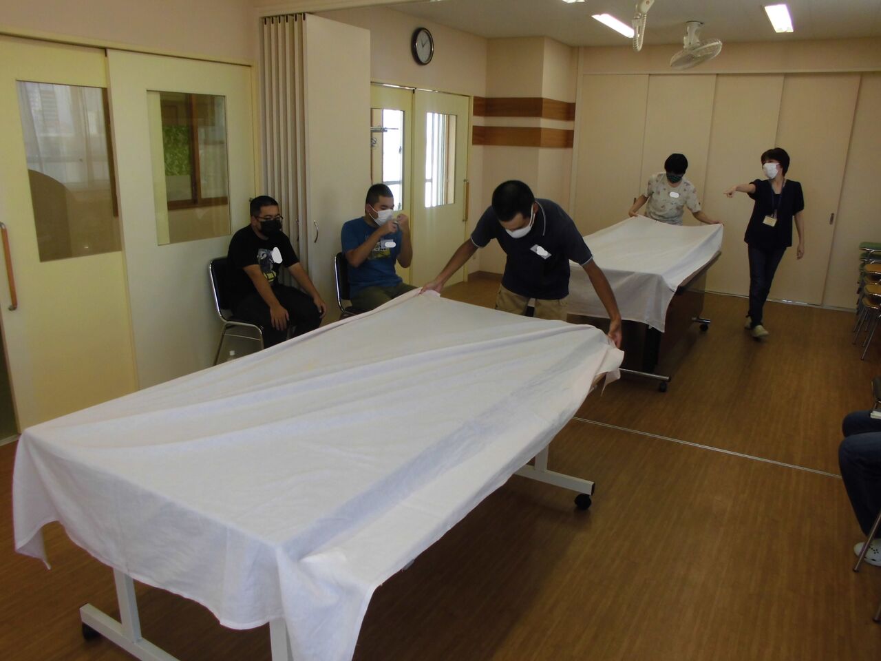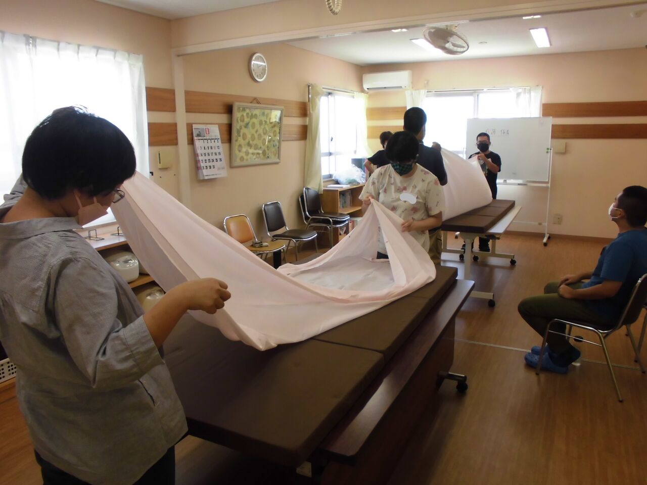 (ペアでシーツ交換をしよう!声を掛け合って効率よく進めています。)