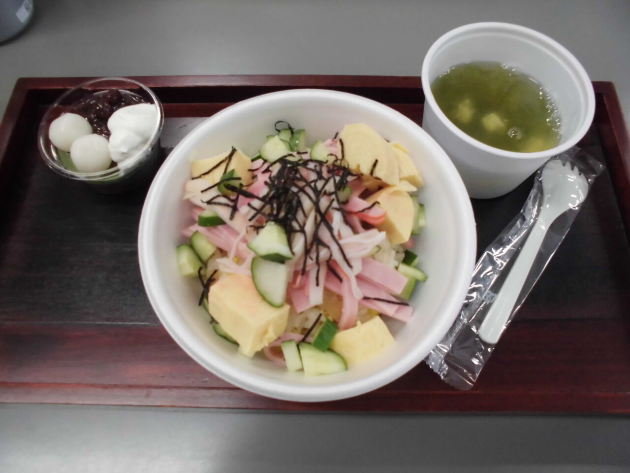 (メニュー:ちらし寿司、すまし汁、水ようかん。美味しかったです。)