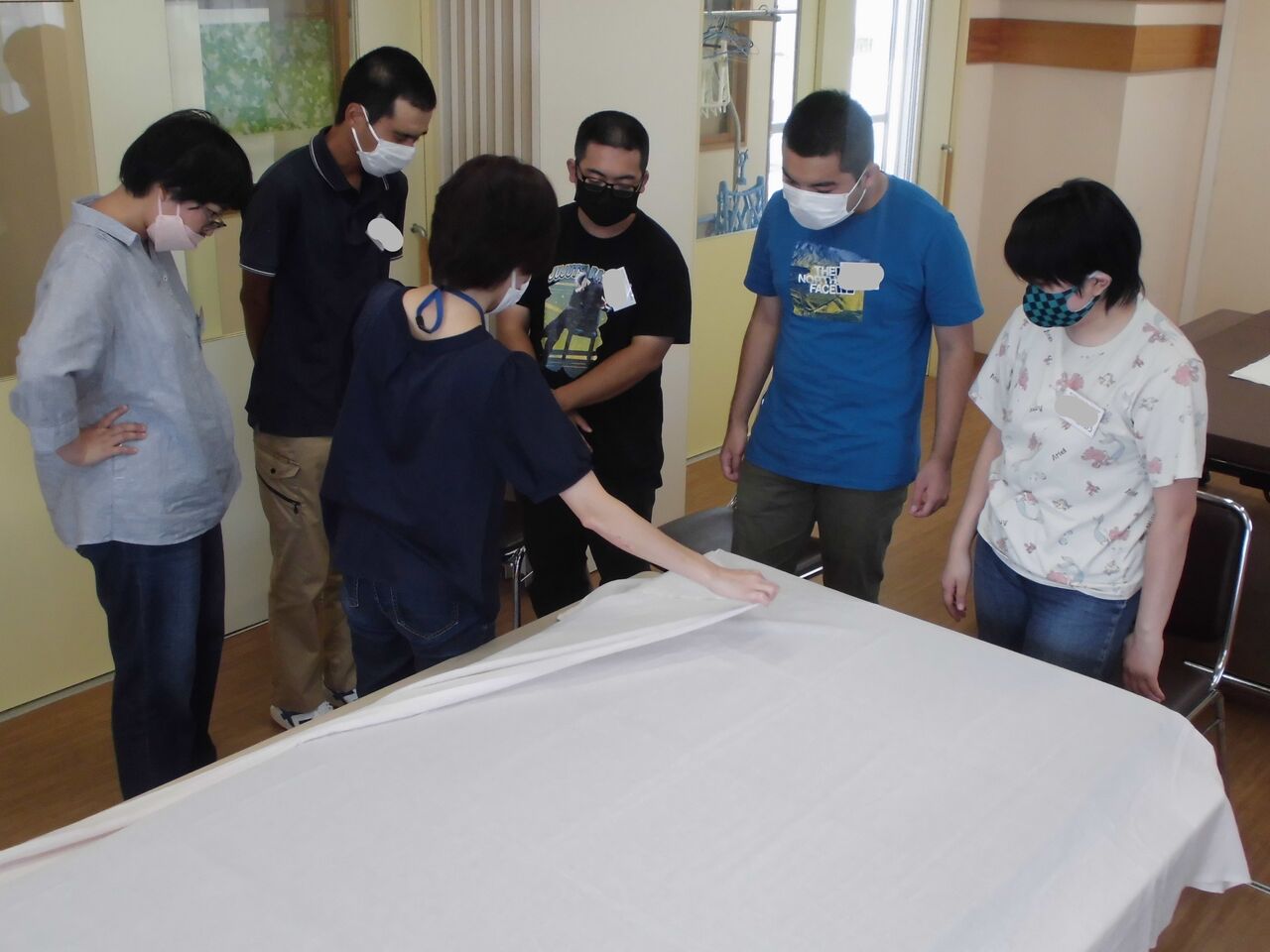 シーツ交換の仕事で活躍しています。座学で体験してもらい、自分に向いて