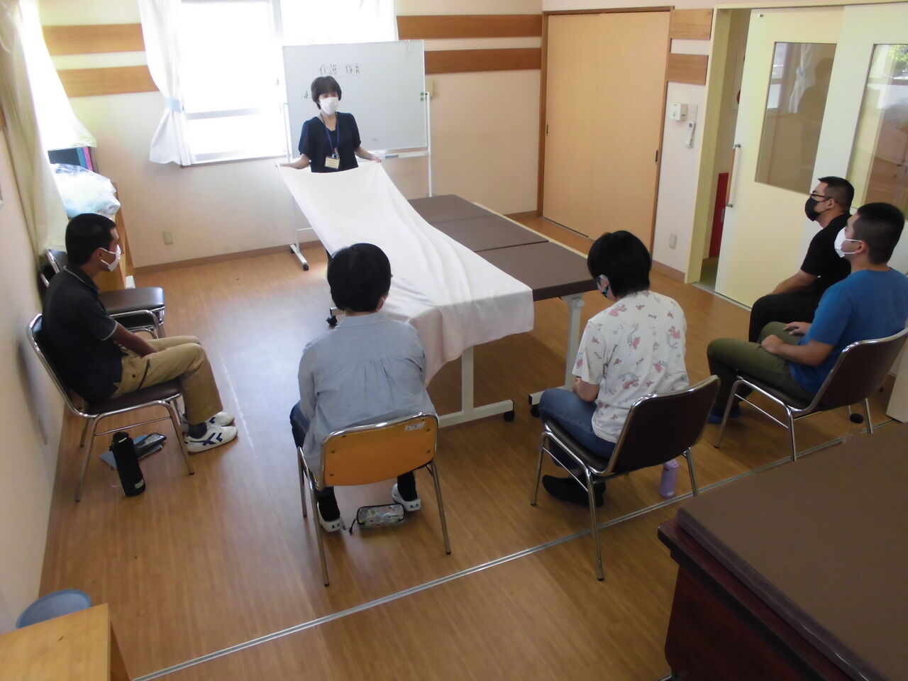 (シーツ交換のポイントの説明。みんな真剣に見て聴いています^^)