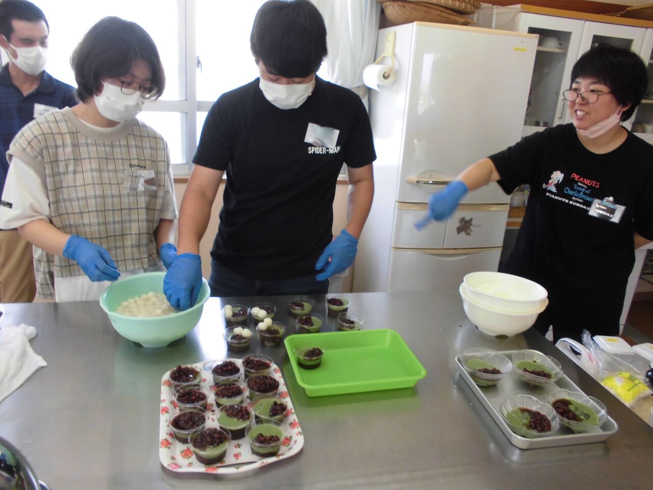 (水ようかん作り。「白玉は2つだよ」と声を掛け合います。)