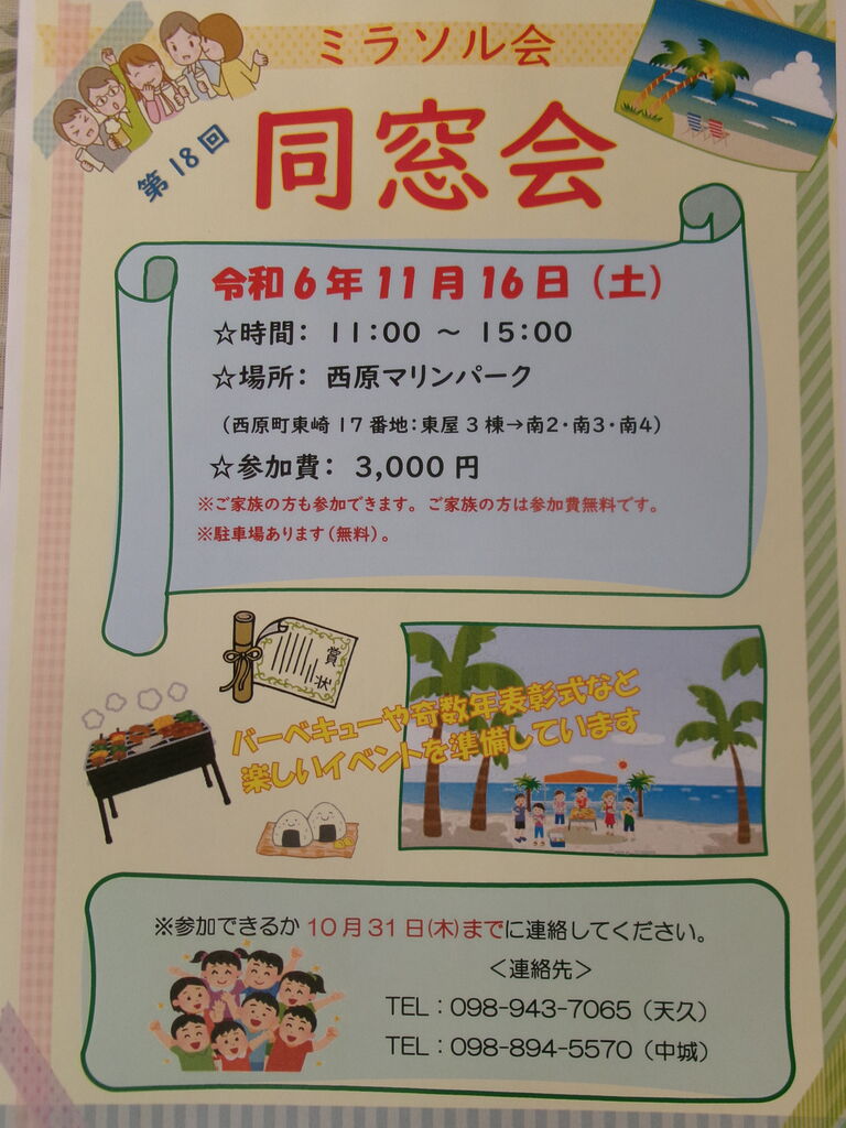 2024年10月10日 第18回ミラソル同窓会のお知らせ 今年も西原マリンパークで第18回ミラソル同窓会を開催致します。「就労サポートセンターミラソル」と「西原シティ」で送迎を利用できます。送迎を希望する方は、参加の連絡の際に伝えてください。みなさん、同窓会で大いに盛り上がりましょう!参加する方は、早めにミラソルまで連絡をください。 カテゴリなしの他の記事 < 前の記事次の記事 > コメント コメントフォーム 名前 コメント 記事の評価 リセット リセット 顔 星 情報を記憶 コメントを投稿する